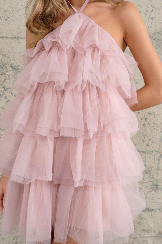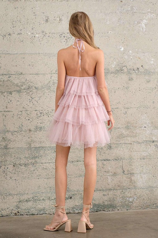 Nude Halter Neck Tulle Ruffle Mini Dress