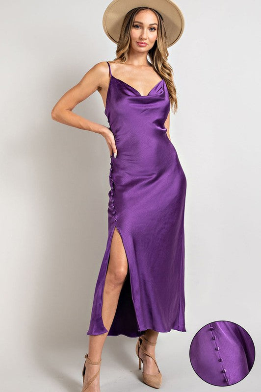 Elegant Maxi Dress Made In A Satin Fabric With A Cowl Neck Design, Adjustable Straps, And Front Side Slit. Perfect For Wedding Or Bachelorette Season!