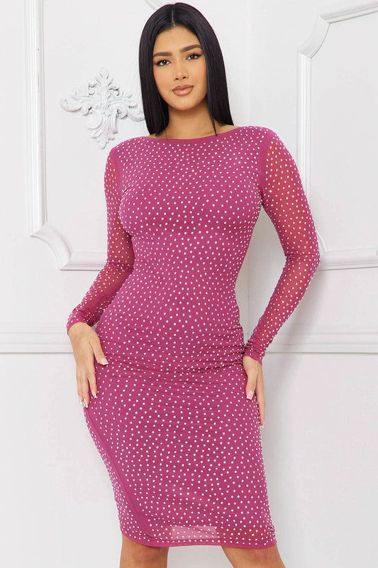 Rose Violet Translucent Rhinestone Midi Dress
