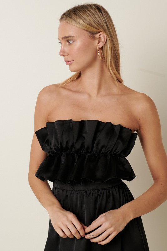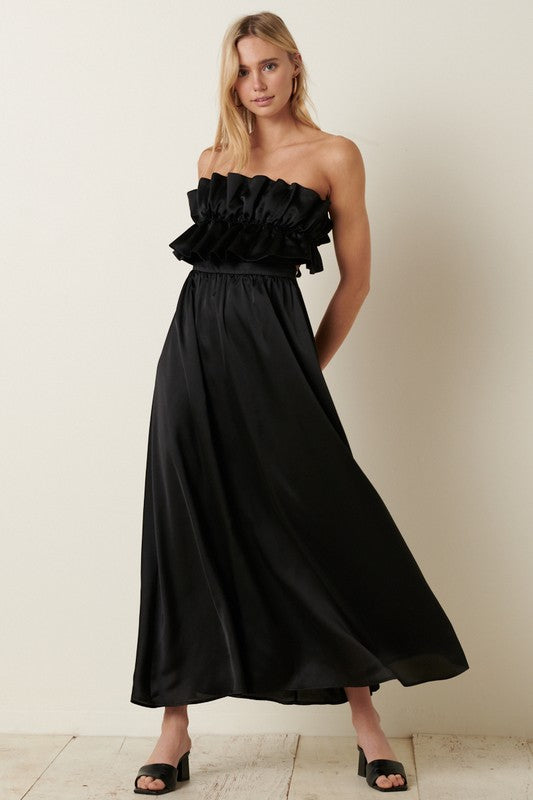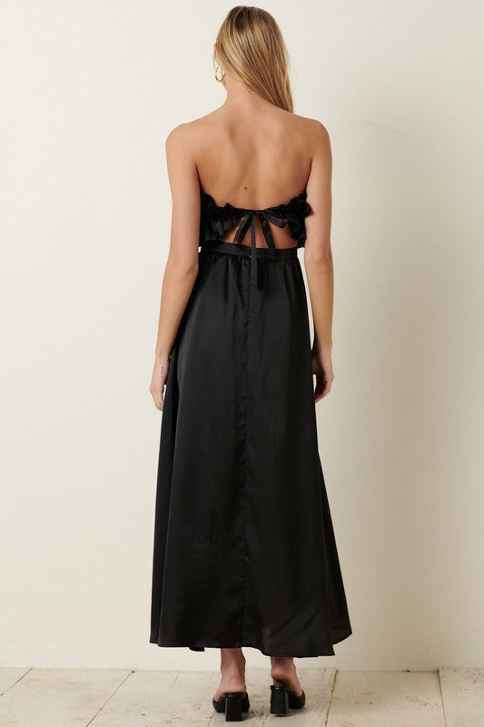 Satin Woven FabricRuffled BustTie Back Detail Maxi Length Skirt Part Invisible Zipper ClosureSkirt Part LinedStrapless Maxi DressModel Is 5' 9" And Is Wearing Size SmallFabric Contents96% Polyester, 4%spandex