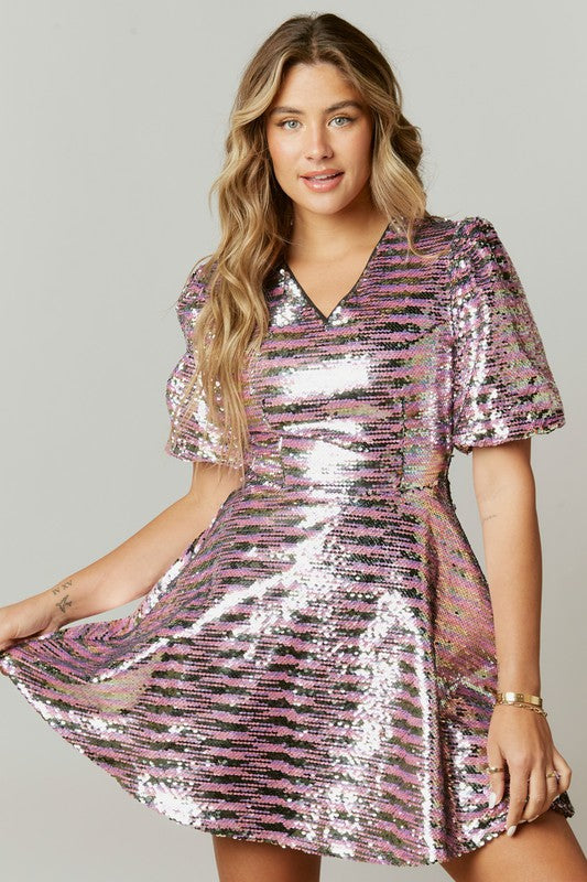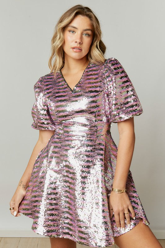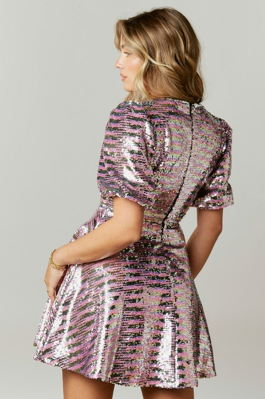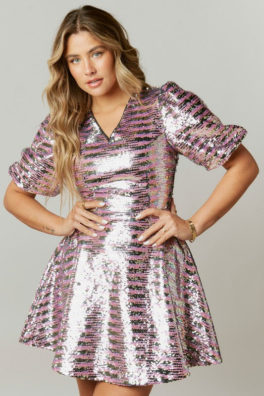 Festive Sequin Babydoll Mini DressV NecklineLong Balloon Sleeves