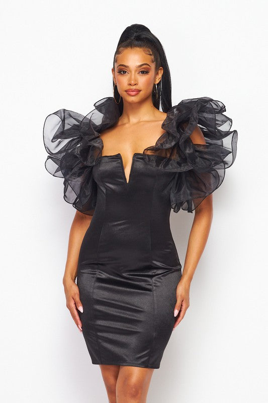 Front V Wired Organza Oversized Ruffle Mini Dress