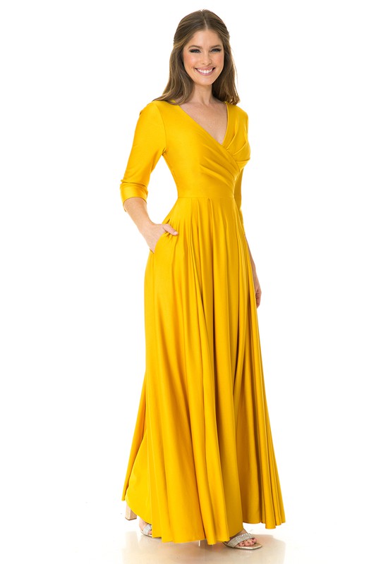 Yellow Sleeve Wrap Pleated Flare Pockets Formal Dress