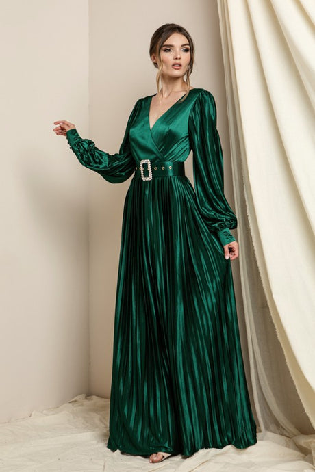 Emerald Green Surplice V Neck Satin Dress With Belt