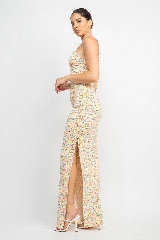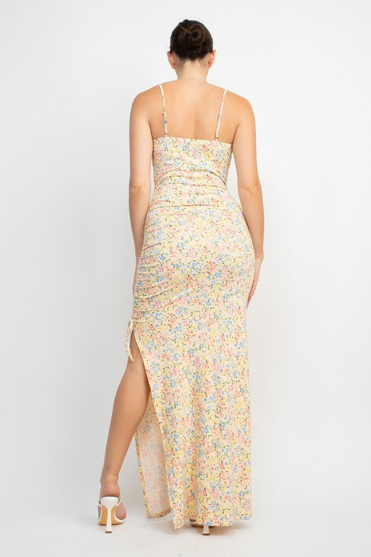 Baby Yellow Floral Slit Ruched Maxi Dress