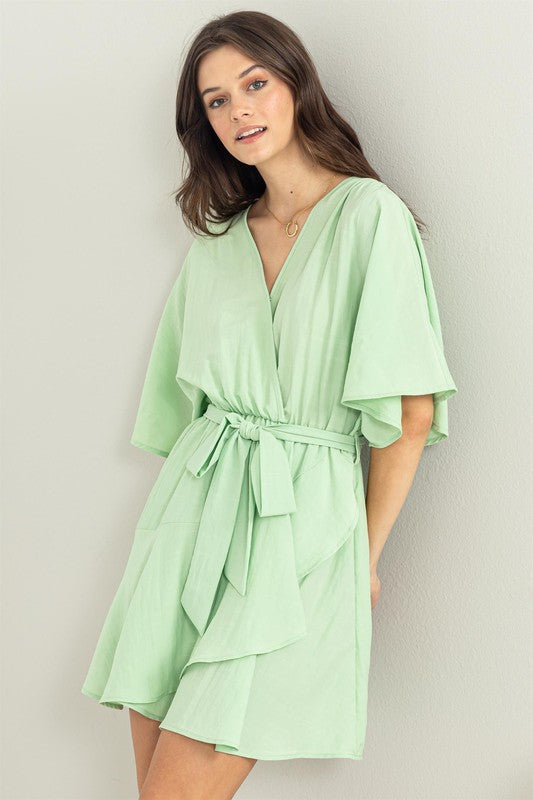 Made To Make You Stand Out, This Dress Has A V-Neck, Gathered Shoulders And Relaxed Short Sleeves. High Waist With Belt Loops Is Accentuated With A Self-Tie Sash Belt, While The Wrap-Style Silhouette Ends At A Mini Hem.