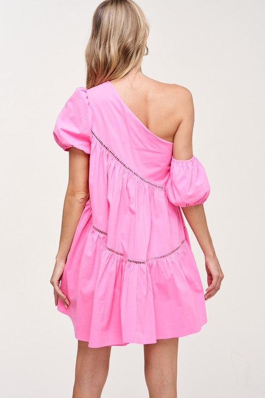 Pink One Shoulder Flare Mini Dress