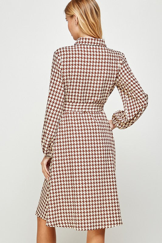 - Featuring Woven, A-line, Printed And Casual Style - Houndstooth Pattern - Collared - Button Front - Bishop Sleeves - Waist Tie - Knee Length - Model Is 5 9 Tall, 34b Chest, 24 Waist And 34 Hips And Wearing Size SmallFabric Contents100% Polyester