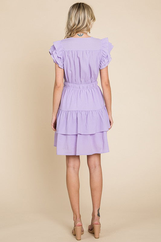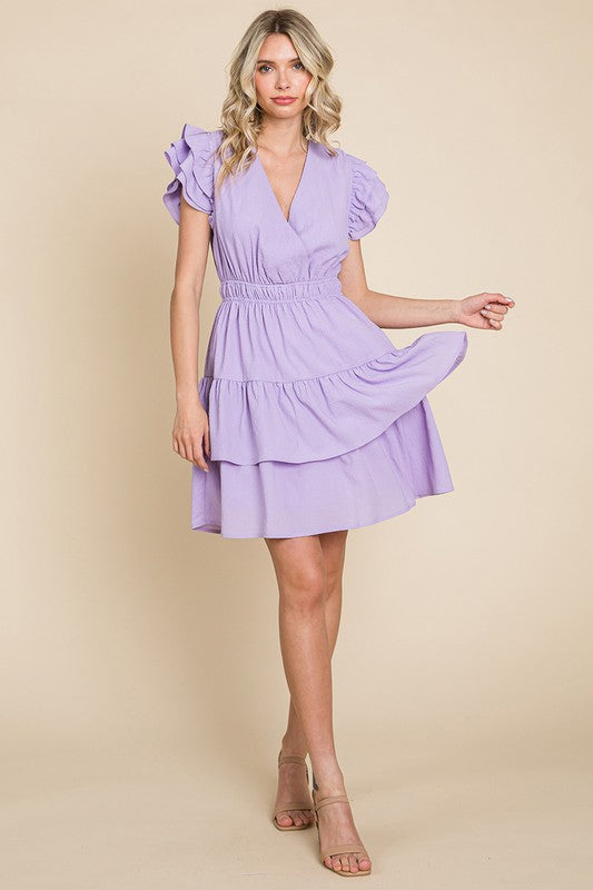 Lavender Ruffled Waistband V Neck Tiered Wrap Dress