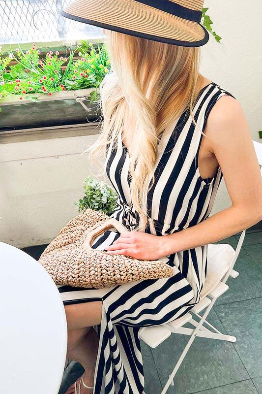 V-neck Sleeveless Tie Waist Slit Detail Stripe Maxi Dress