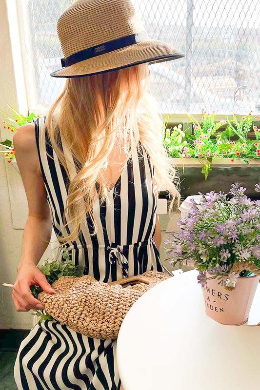 Black V-neck Sleeveless Tie Waist Slit Detail Stripe Maxi Dress