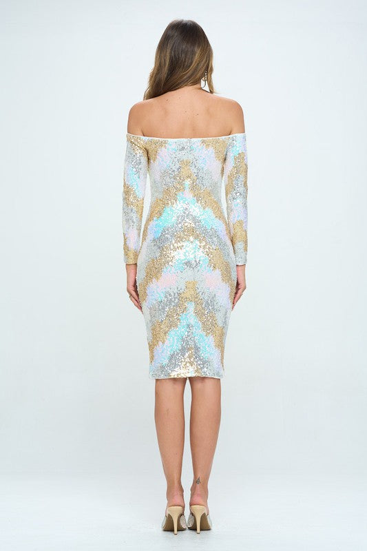 Off The Shoulder Sequin Mid Dress With Long Sleeves.