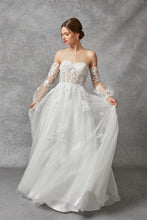 Detachable Sheer Long Sleeve Off Shoulder Sweetheart Top A Line Wedding Gown. 100% Polyester, Tulle, Embroidery, Lace, Crystals, Beading, Sequins