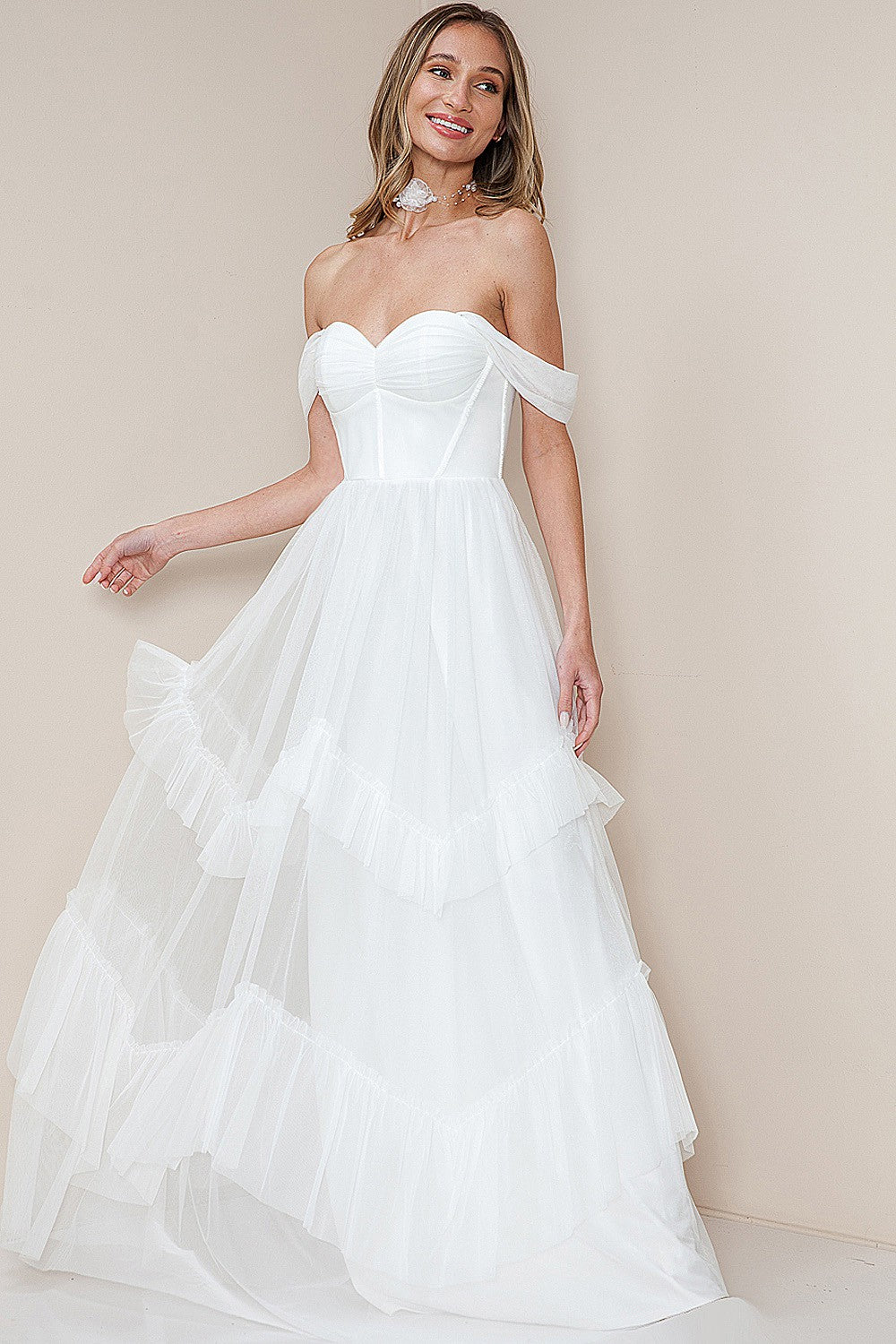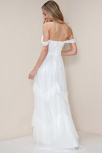 - Off Shoulder Ruffle Layered Tulle Maxi Dress- 100% Polyester- Dress- Prom Dress- Bridesmaid Dress- Bridal Dress- Wedding Dress- Party Dress- Homecoming Dress- Cocktail Dress- Gowns