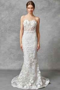 Strapless Sweetheart Puff Sleeve Wedding Dress. Detachable Sleeve, Mermaid, Corset, Train.100% Polyester, Tulle, Embroidery, Lace