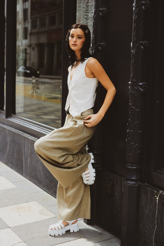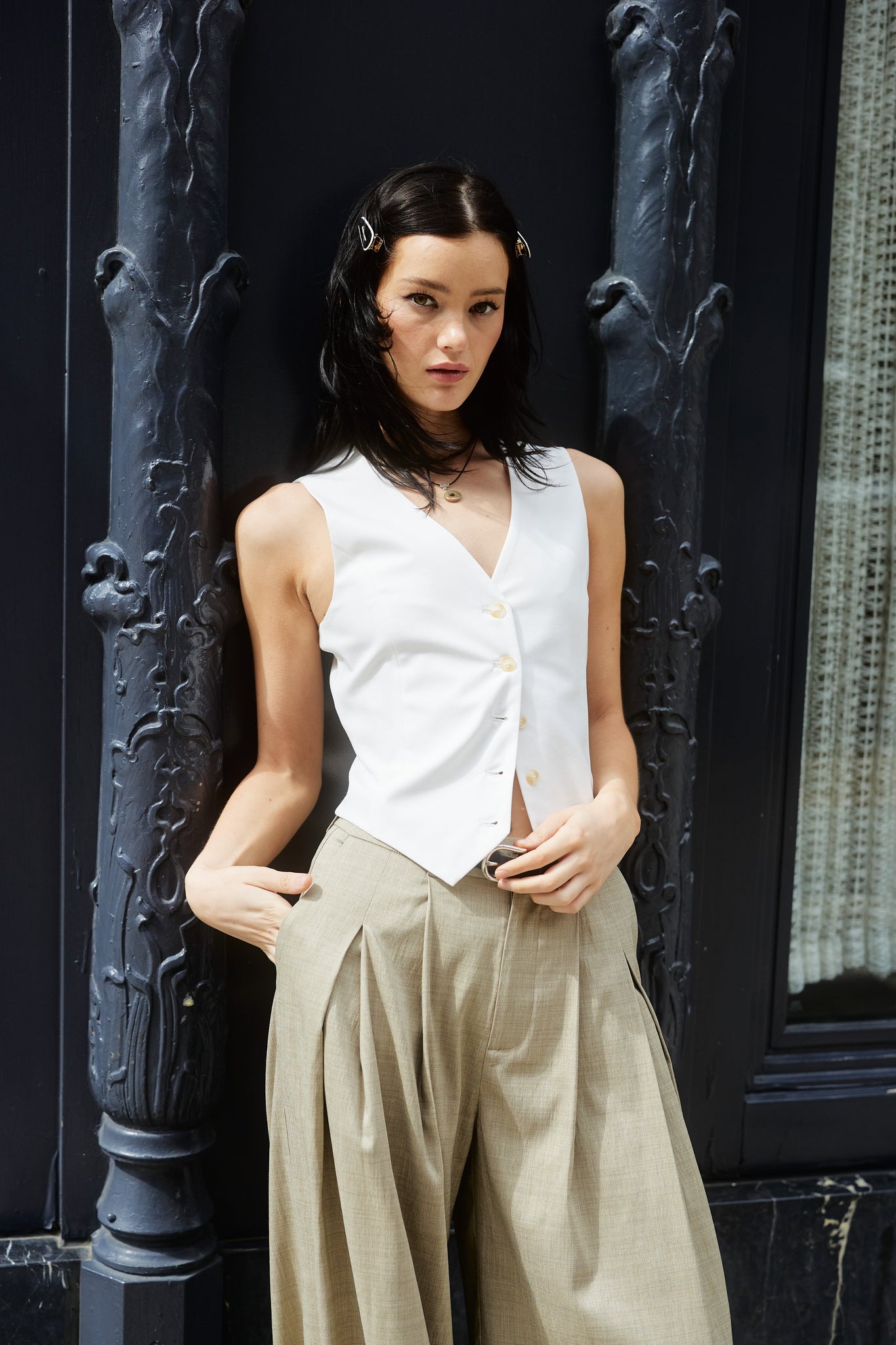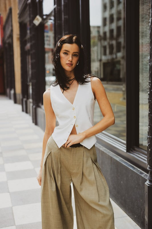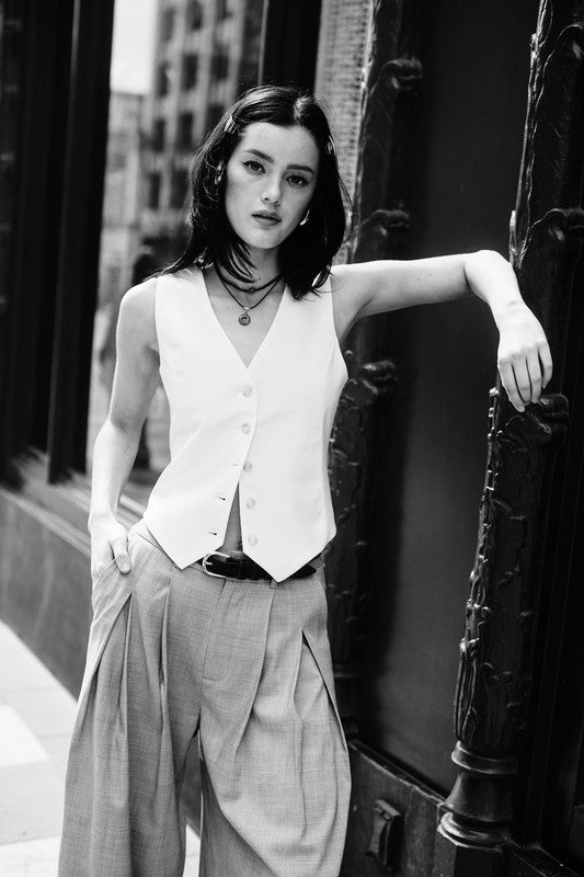A Revamped Version Of Our Beloved Tailored Vest! This Sleeveless Vest In A Classic Solid Design Showcases A V Neckline, A 5-Button Front Closure, A Pointed Front Hem, And A Regular-Length Fit To Ensure It's Not Overly Cropped - Making It A Timeless Wardrobe Staple.