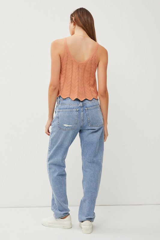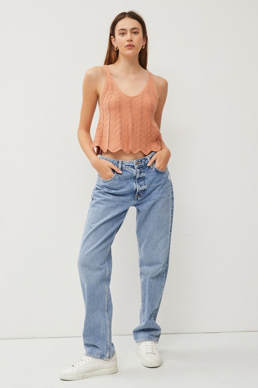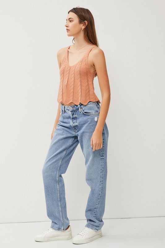 Hazelnut Crochet V-Neck Scalloped Crop Pointelle Knit Tank