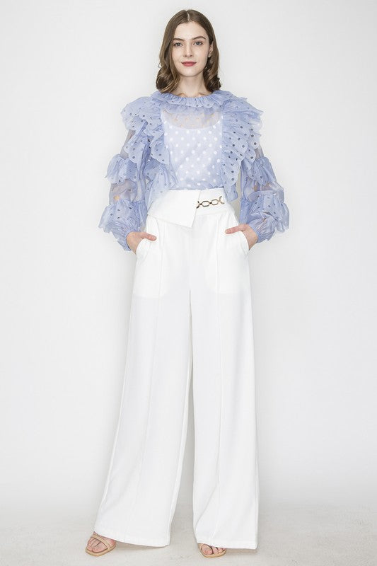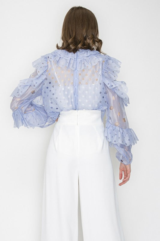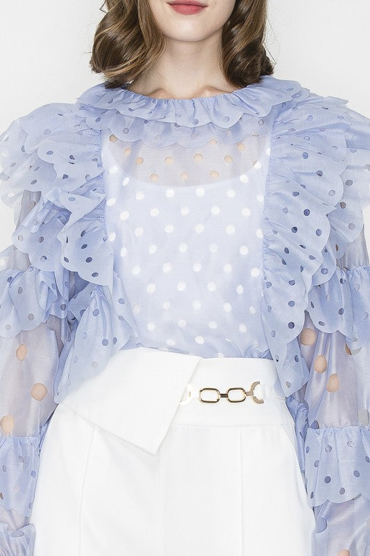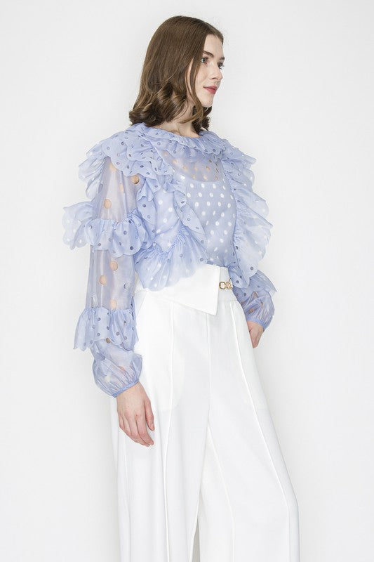 Ruffleed Laser-Cut Long Sleeves Blouse Top-Hidden Zip At Back-Model Is 5'8" And Is Wearing A Size Small