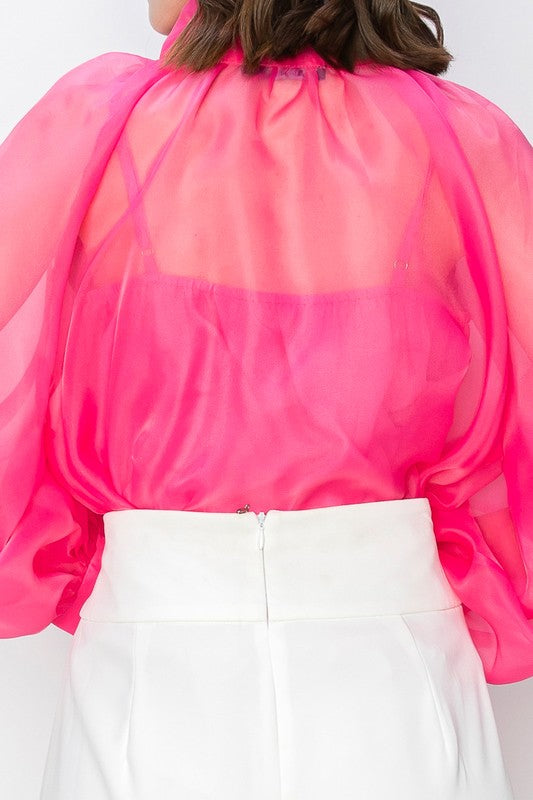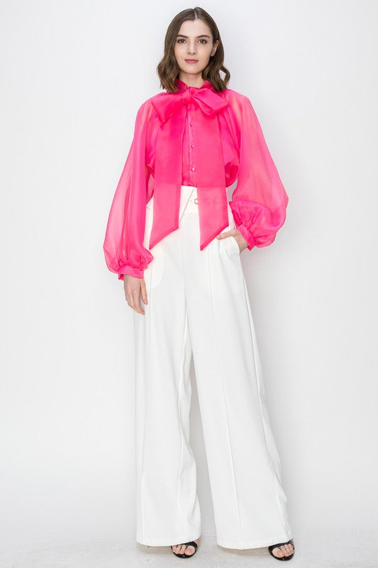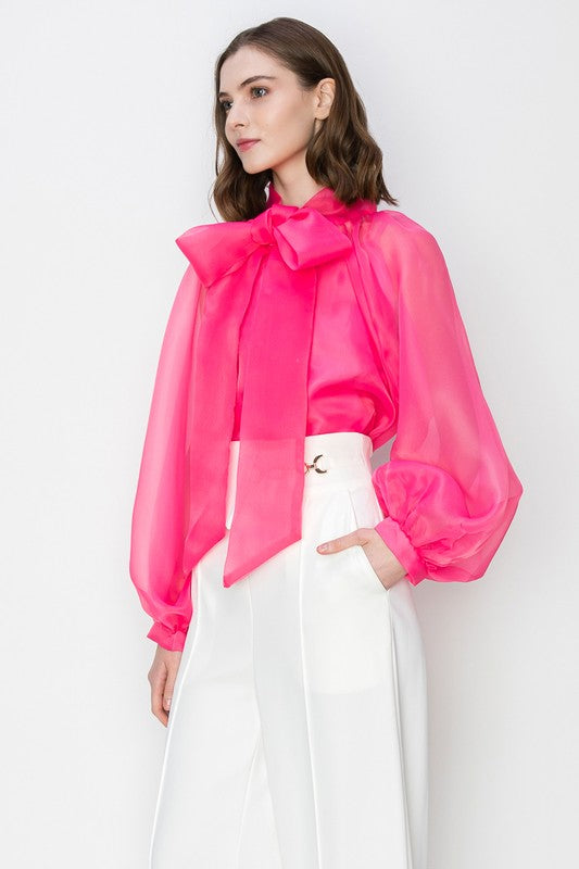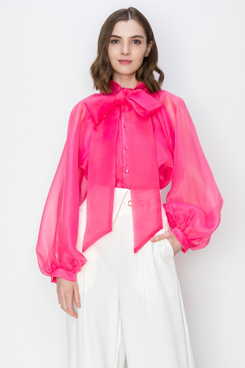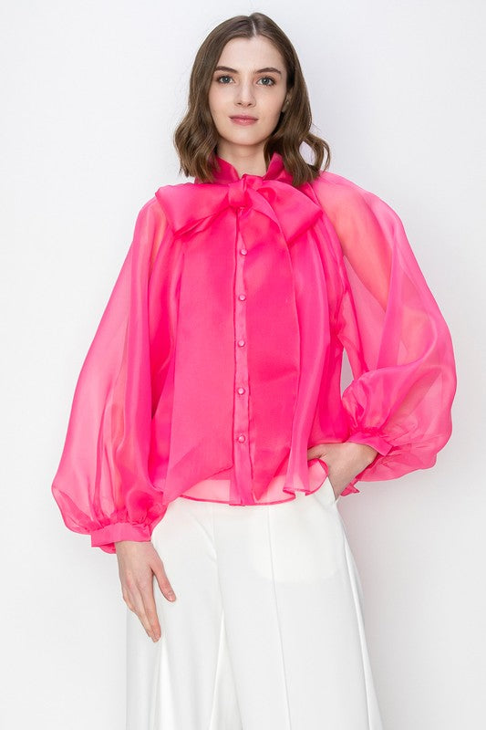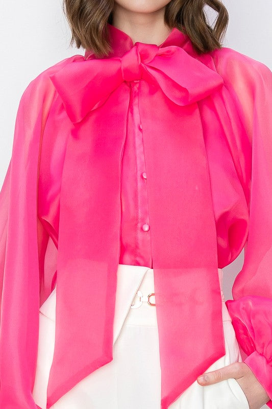 Barbie Pink Sheer Organza Bow Long Sleeve Blouse Top