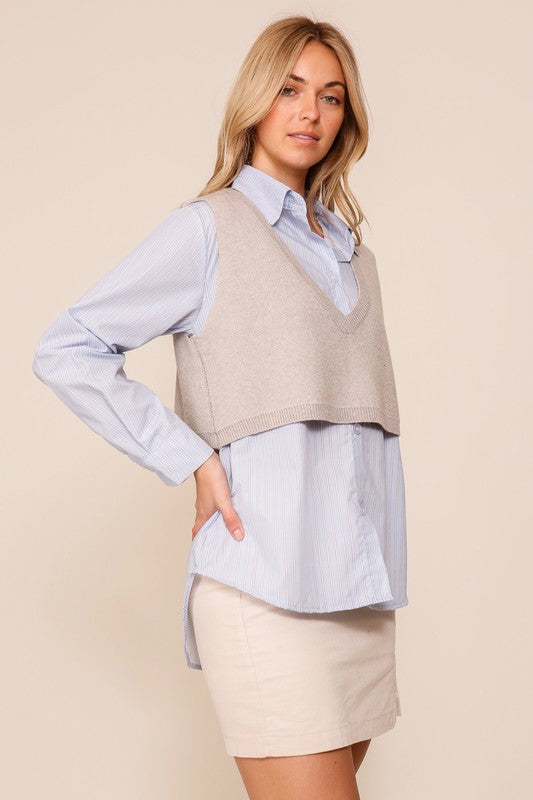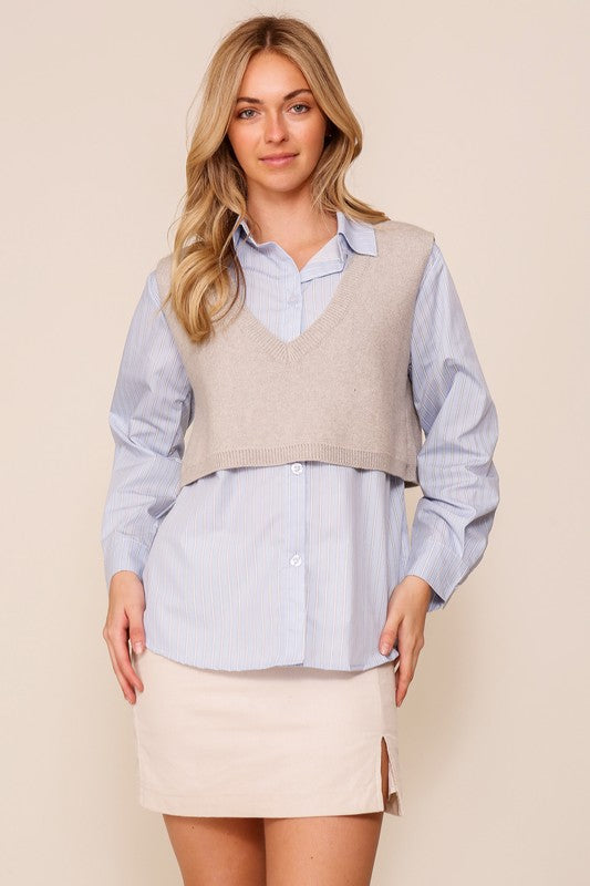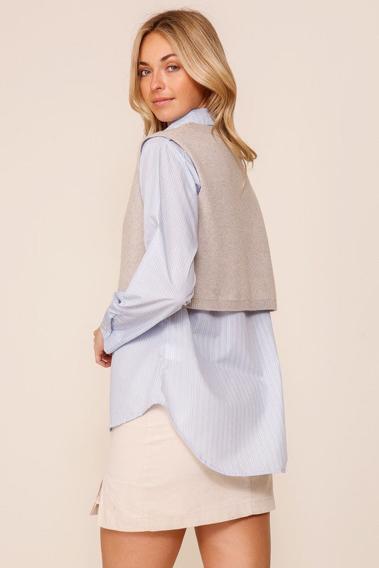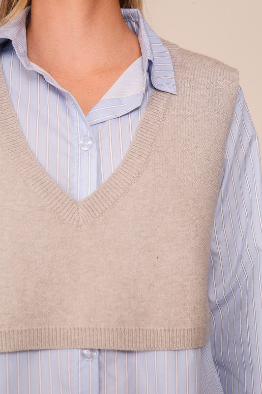 Blue/Grey Striped Button Down Shirt With Knit Vest