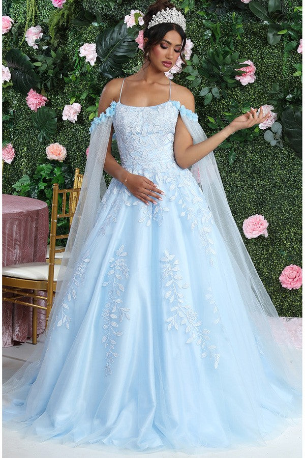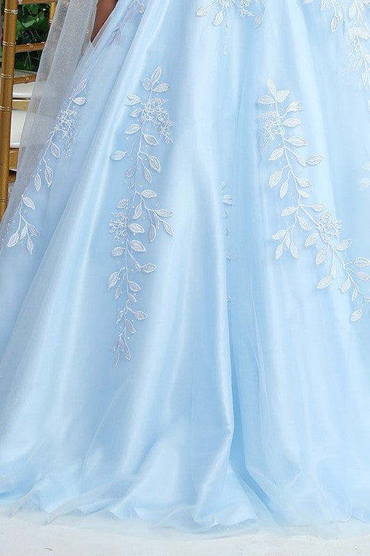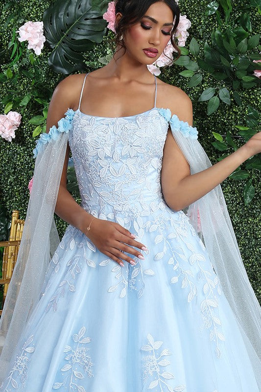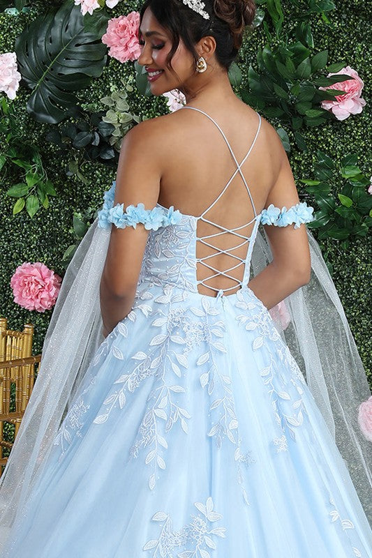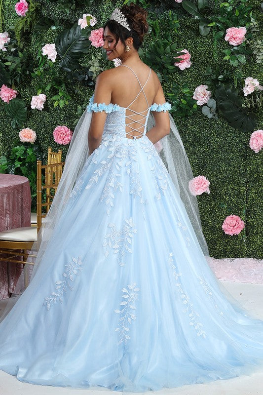 Botanic Lace 3D Floral Applique Cape Sleeve Quinceanera Ball Gown. Jewel Detail, Corset Closure.