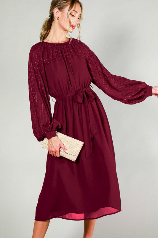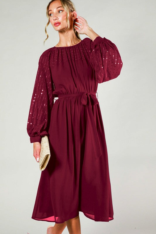 Round Neck Puff Long Sleeve With Sequin Detail Tie Waist Midi Dress