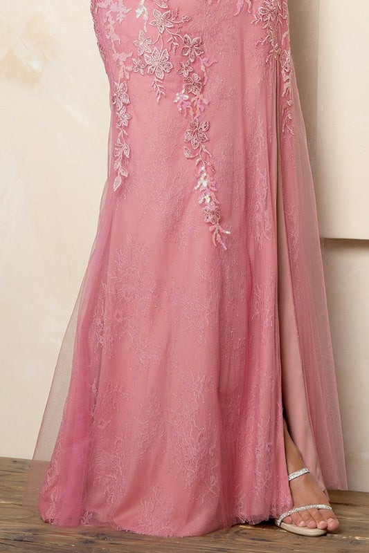 Dusty Rose Embellished Bustier Top Front Slit Sheath Dress