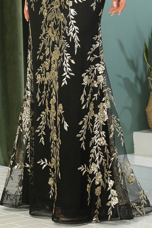 Black/Gold Illusion Top Embroidery/Glitter Trumpet Dress