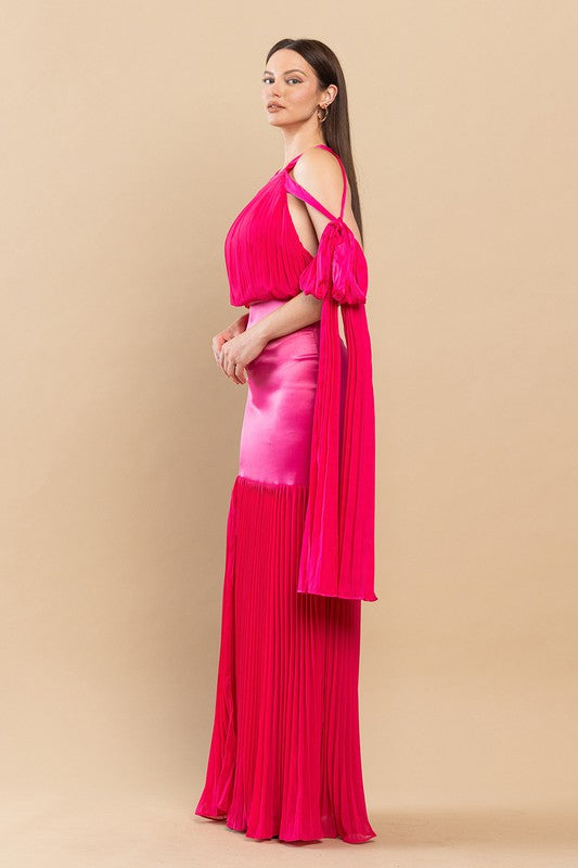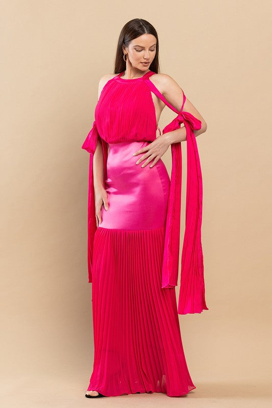 Features Cutout At Dropped Shoulders, Backless And Ribbon & Pleated Fringe Detailing, Sexy Open Back With An Adjustable Tie, Hidden Zip Closure At Back, Front Leg Slit In Maxi Length That's Perfect For Showing Off Your Curves. Non-Stretchy.