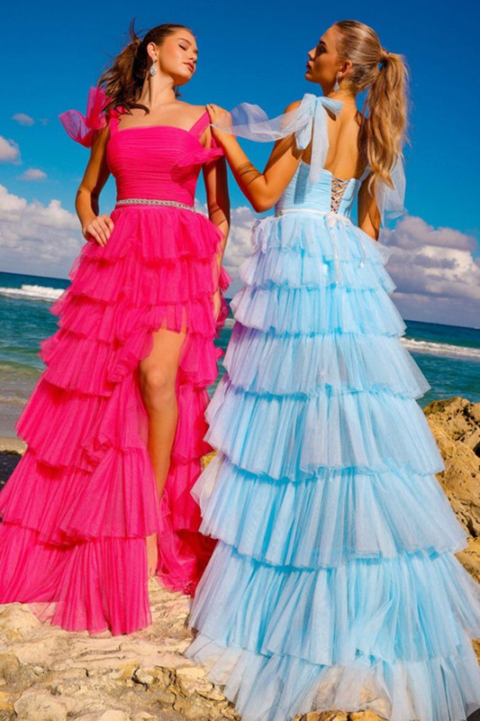 Fuchsia Bow Shoulder Pleated Top Tiered A Line Dress