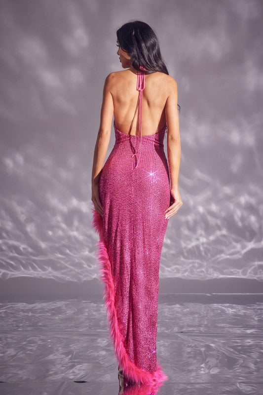 Maxi Sequin Dress With Fur Trim Detail. High Stretch And Lined, Halter Neckline And Zipper Back Closure.