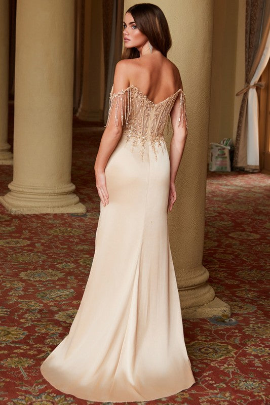 Bead Fringed Off Shoulder Bead Sequin Embellished Top Satin Skirt Design Contrast Dress.