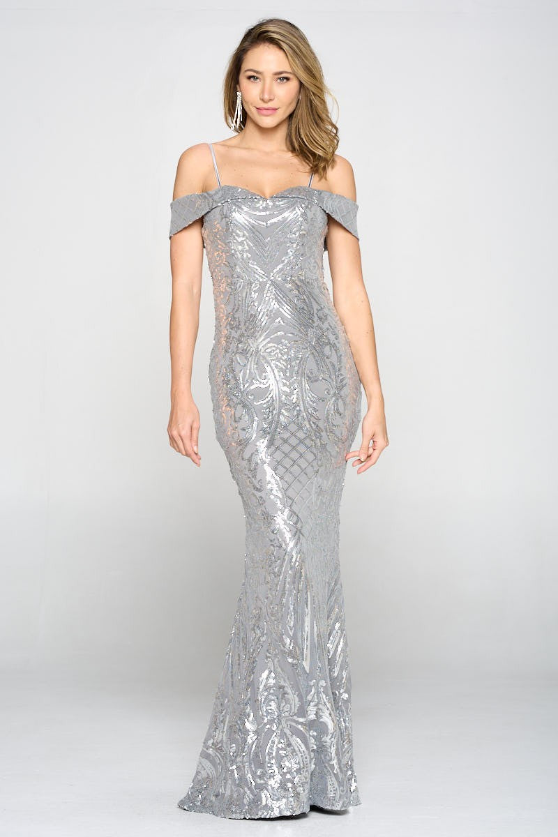 Grey Off Shoulder Sequence Dress