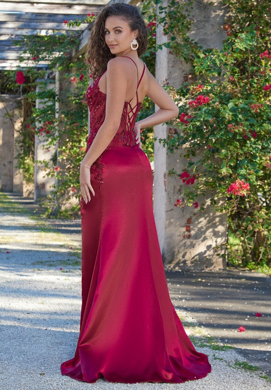 The Ivy Gown Is A Vision Of Opulence And Allure, Blending Modern Sophistication With Timeless Glamour. It's Luminous Sheen Catches The Light As You Move, While The Sleek Slit Adds A Touch Of Contemporary Allure. The Intricately Beaded Bodice And Corset-Like Fit Accentuate Your Curves, Ensuring An Enchanting Silhouette, While The Adjustable Lace-Up Back Guarantees A Customized And Perfect Fit For Your Special Occasion.