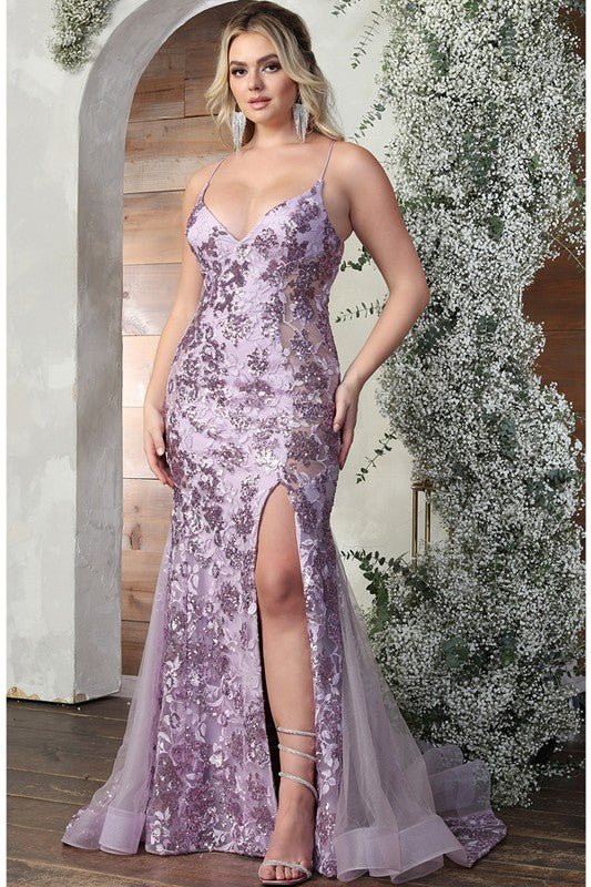 Lilac Deep V Neck Embroidery/Sequin Embellished Mermaid