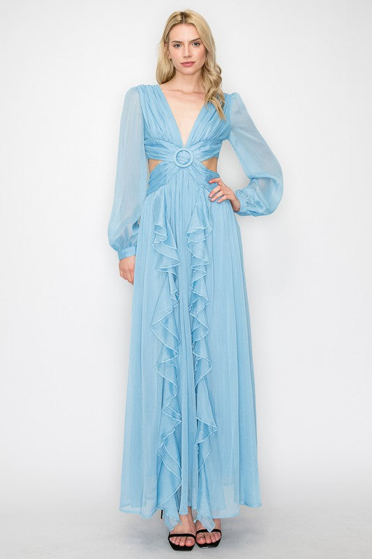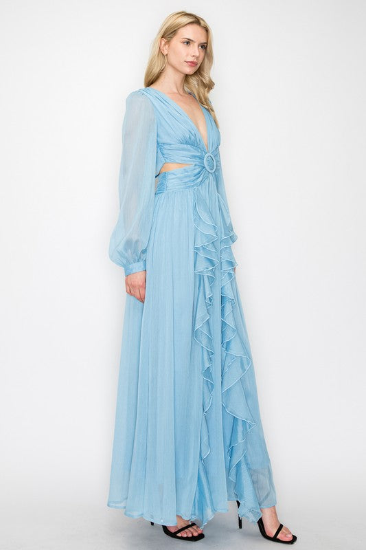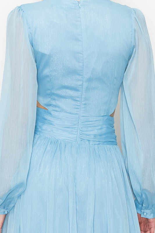 Long Puff Sleeves Shimmer Fabric Side Cut-Out Maxi