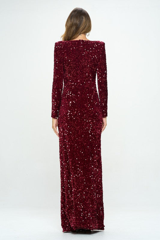 Berry Long Sleeve Velvet Sequin Maxi Dress