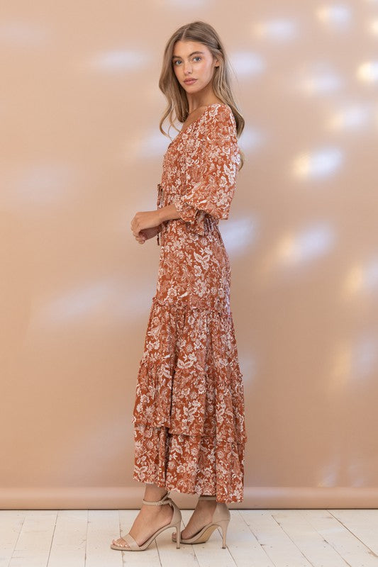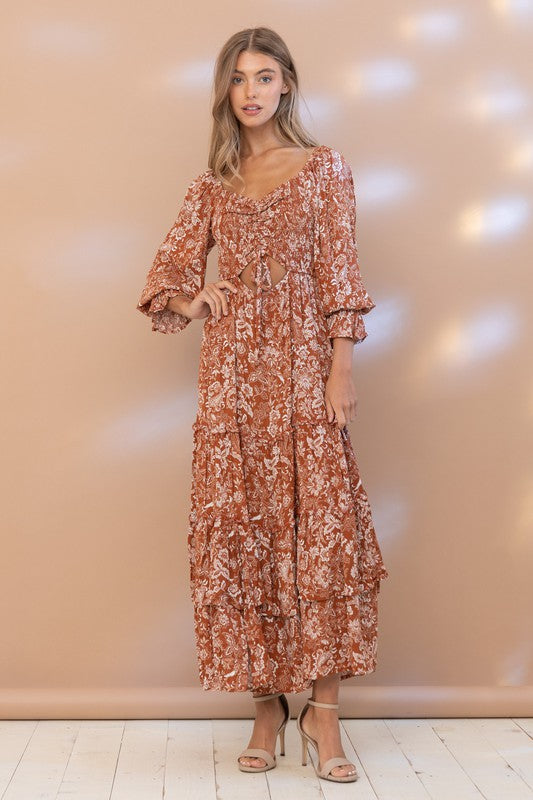 Long Slv Cinch Tie Cut Out Front Tiered Slit Ruffle Maxi Dress