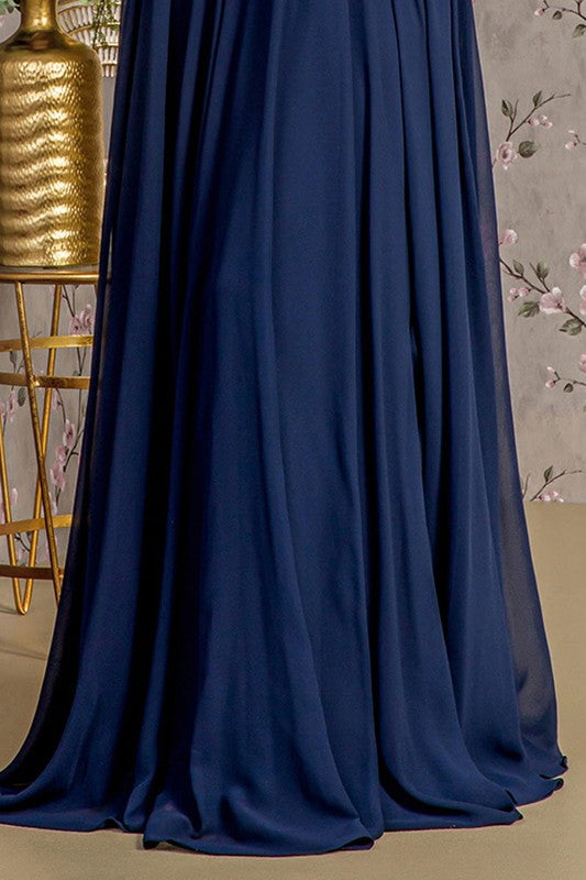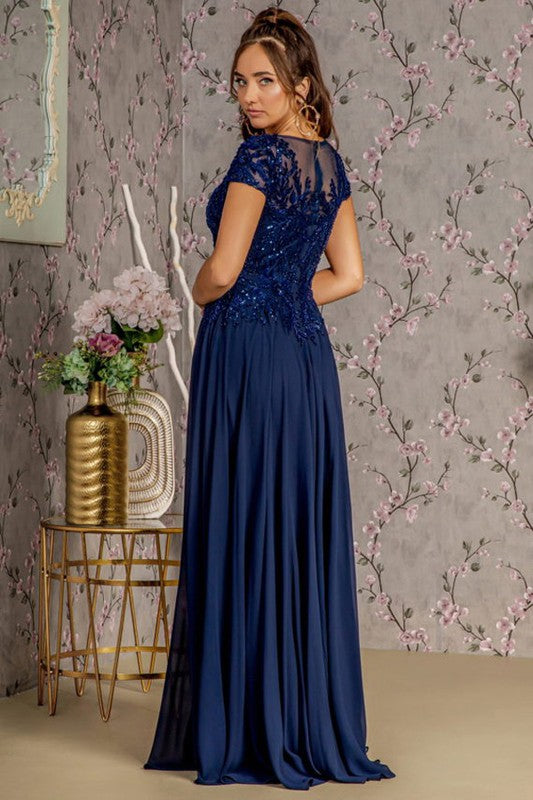 Navy Embroidery/Sequin Illusion V-Neck A Line Mob Dress