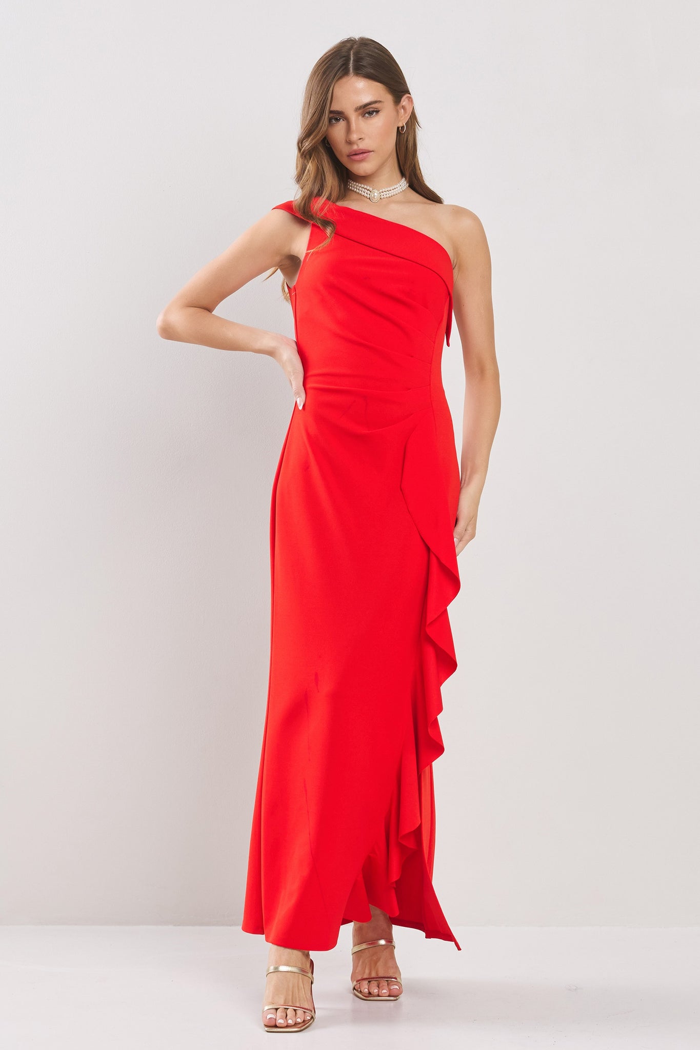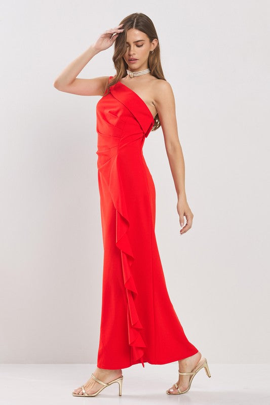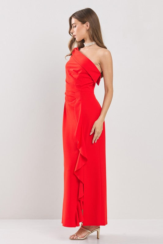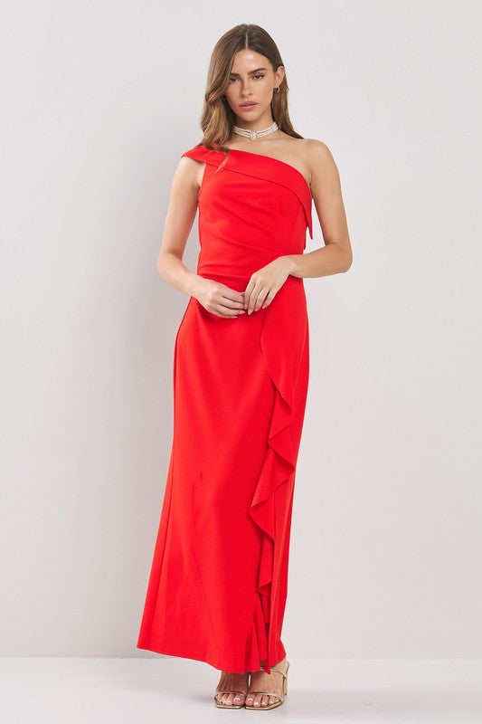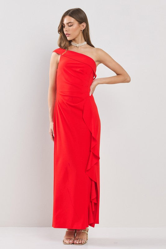One Shoulder Side Dropped Ruffles Maxi Dress- One Off Shoulder With Dialog Line- Zipper Closure- Side Ruffle Dropped On Bottom- Side Slit- StretchyModel Is 5'8"/32/23/35 And Wearing Size 6 (S Size)
