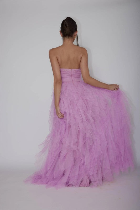 Strapless Cascading Tulle Mesh Maxi Dress With Boning In BodiceLinedFabric Contents100% Polyester