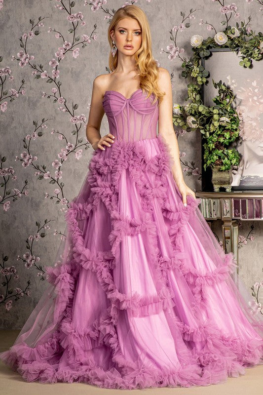 Strapless Sweetheart Illusion Top a Line Ruffle Dress. Open Back, Zipper.