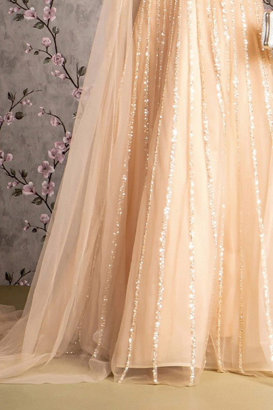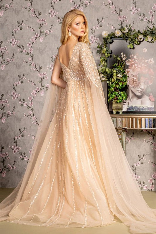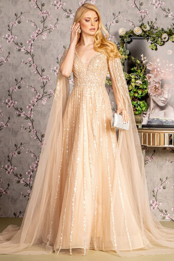 Champagne Rain Sequin Deep V Neck Cape Sleeve A Line Mob DRE