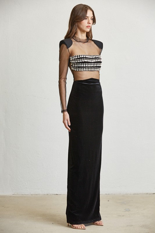- Mesh And Velvet Fabric- Padded Shoulders- Mesh Top Bodice- Rhinestone Jewel Detailing- Rear Slit Finished Hemline- Invisible Zipper Back ClosureFabric Contents- 95% Polyester 5% Spandex