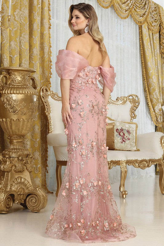 Off-Shoulder Cape Sleeve, 3d Floral Applique Glitter Print Mermaid Dress. Sweetheart, Open Back, Zipper Closure.