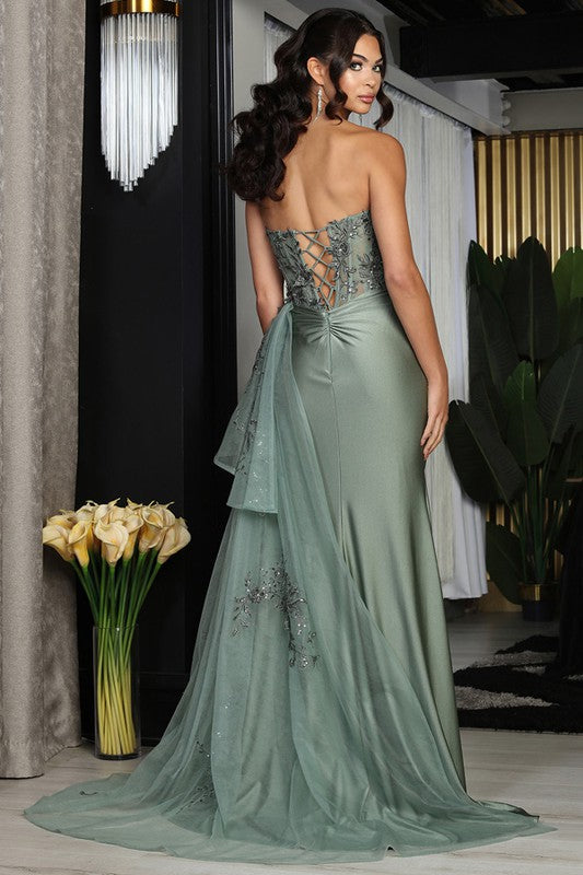 Sage Bustier Embroidery Top Waist Cape Sheath Dress