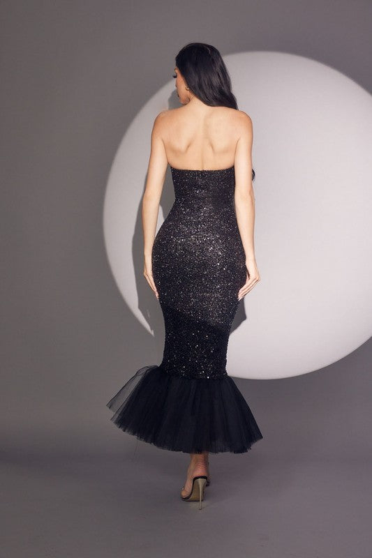 Fitted Sequin Dress With Tulle. Midi Length, Back Zipper Closure, Available In All Sizes For A Full Assortment. Fabric Contents100% Polyester