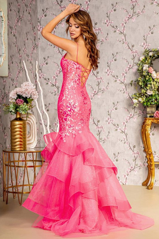 Sequin/Glitter Bustier Illusion Top Trumpet Dress With Ruffle Skirt. Open Back, Corset Closure, Spaghetti Straps. Colors: Hot Pink.Sizes: XS-3XL