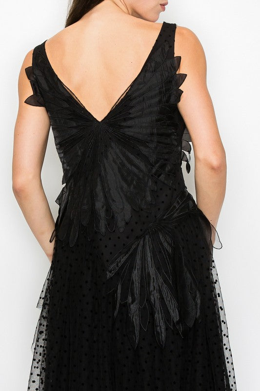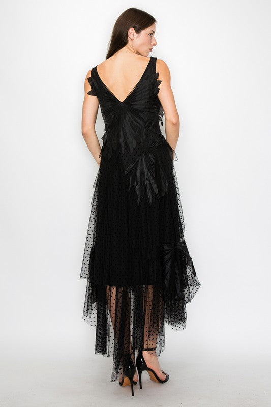 Sleeveless Rhythmic Appliqued Tulle Midi Dress-Layers Of Tulle With Flared Details And An Asymmetric Hem-Mini Dots Tulle-Side Invisible Zipper