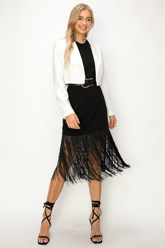 Sleeveless Stretch Bukled Belt Trim Fringed Midi
